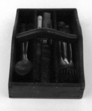 Rechthoekig, rondgebogen draaghensel, verdeeld in drie vakjes. Inhoud: vier vorkjes, vier lepeltjes, twee sauslepels, acht verschillende mesjes- Trefwoorden