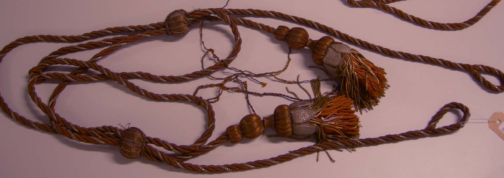 Gordijnkoord met twee kwasten, in vorm. Goud, zilver en koper metaaldraad, met oranje zijde.- Trefwoorden