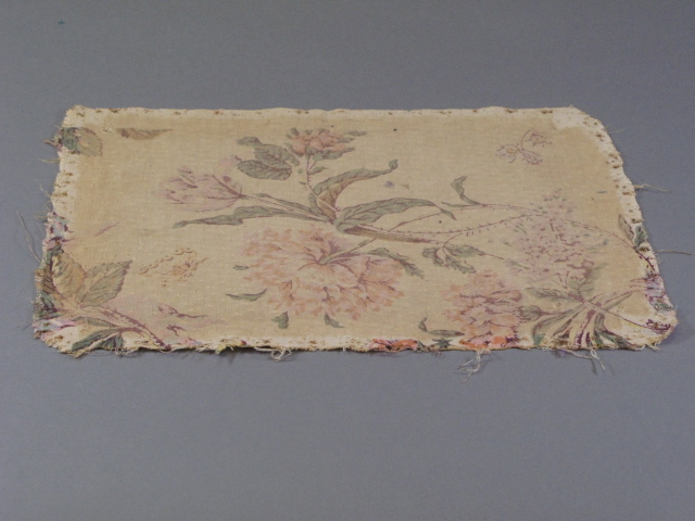 Fragment bekledingsstof. Onderbekleding voetenbankje, effen linnen. Aan de randen van de stof zijn spijkergaatjes te zien. De kleuren op de rand zijn minder verbleekt. Stof verbruind, de kleuren zijn verbleekt. Afkomstig van resten van de gordijnen van de koepelkamer van Museum Willet Holthuijsen.- Trefwoorden
