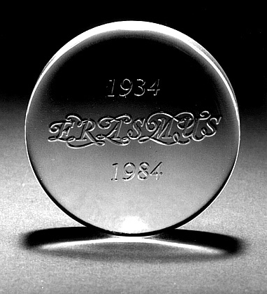 Massieve schijf van persglas met op onderzijde het opschrift: 1934/ ERASMUS/ 1984/.