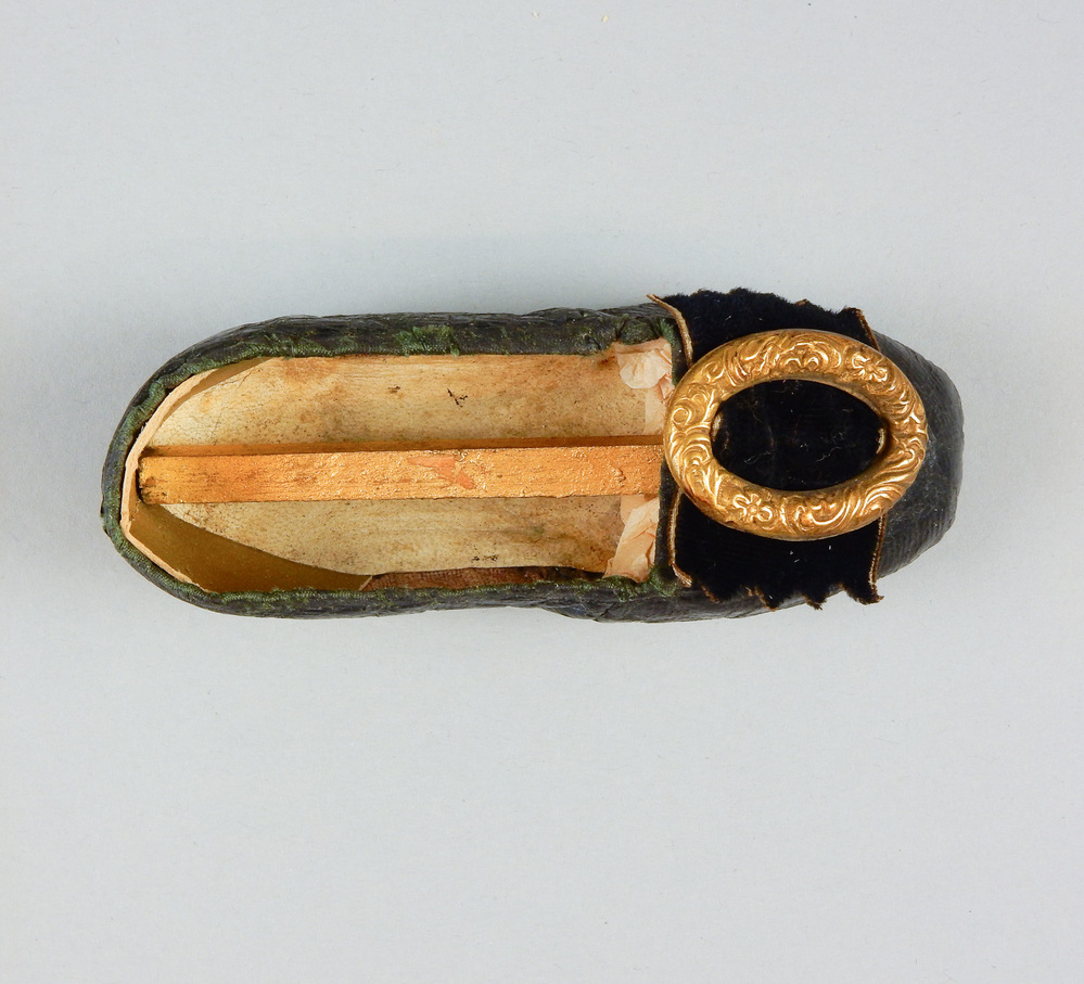 Zwart leren poppenschoen met gesp en fluwelen strik.- Trefwoorden