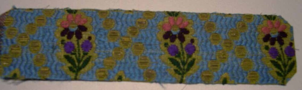 Lichtblauwe staal met met ingeweven veelkleurig motief. Bloemen in roze, paars en groen, tussen rondjes.- Trefwoorden