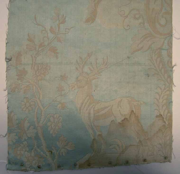 Lichtblauwe staal met cremekleurig motief. Hert met bomen.- Trefwoorden