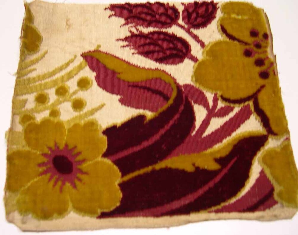 Cremekleurige staal met bloemmotief opgebouwd uit gele en rode fluweel- Trefwoorden