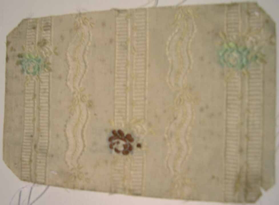 Cremekleurige staal met een ingeweven motief en rode en groene bloemen- Trefwoorden