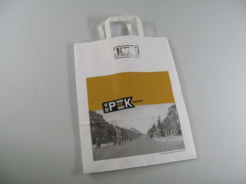 Van der Pek Werkt is een Servicepunt van woningcorporatie Ymere in de Van der Pekbuurt, gevestigd aan de Van der Pekstraat 49. Bewoners kunnen hier terecht voor reparatieverzoeken aan hun woning of aan de openbare ruimte. Binnen het Servicepunt leren medewerkers onder begeleiding van werkbegeleiders het vak, bijvoorbeeld op het gebied van administratie of klussen, zodat ze meer kansen hebben op de arbeidsmarkt. Dit papieren tasje met opschrift ‘V/D PEK WERKT’ draagt een historische foto van de Van der Pekbuurt, afkomstig van het Historisch Centrum Amsterdam Noord. Tevens zit er een stempel op met de tekst ‘KEK IN VAN DER PEK’. ( Sarah Remmerts de Vries)
