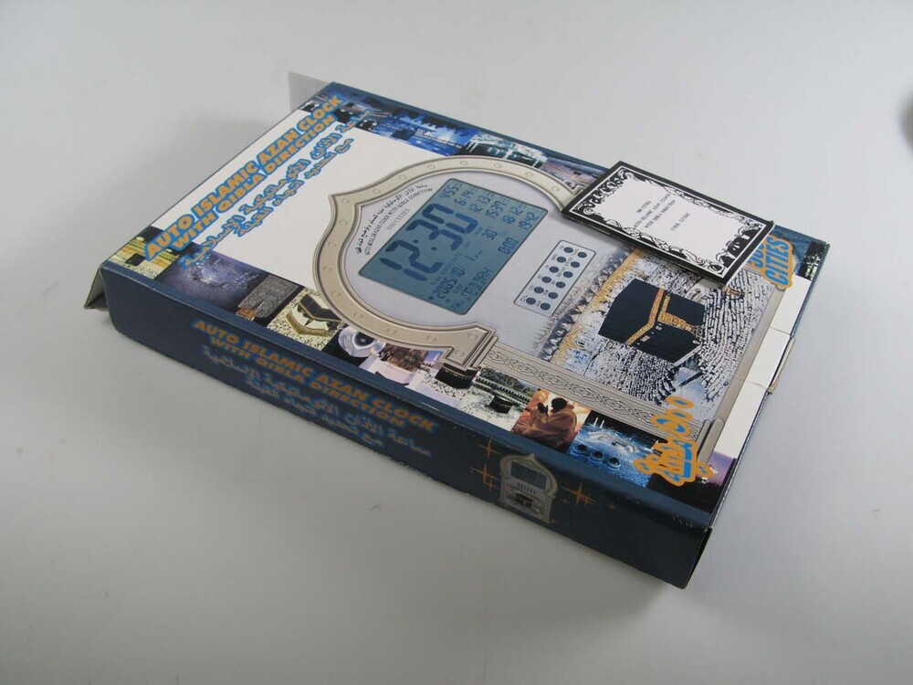 Op de voorkant staat een afbeelding van de Ka'aba, het centrale heiligdom van de islam in Mekka. Als onderdeel van de hadj, de bedevaart naar Mekka, loopt men zeven keer rond de Ka'aba. Ook legt de Ka'aba de islamitische gebedsrichting vast - een moslim bidt altijd in de richting van de Ka'aba. Deze Azanklok geeft ook de qibla, de gebedsrichting met het gezicht naar Mekka aan. De klok is instelbaar voor 500 steden, Amsterdam is nr. 31. De oproep tot gebed is met een volumeknop harder en zachter te zetten.