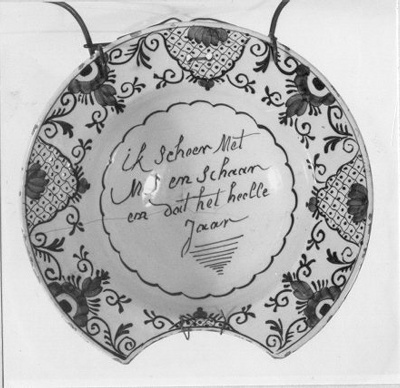 - opschrift in het midden: ik Scheer Met/Mes en Schaar/en dat het heelle/Jaar: in het midden van het plat: ik Scheer Met Mes en Schaar en dat het heelle Jaar