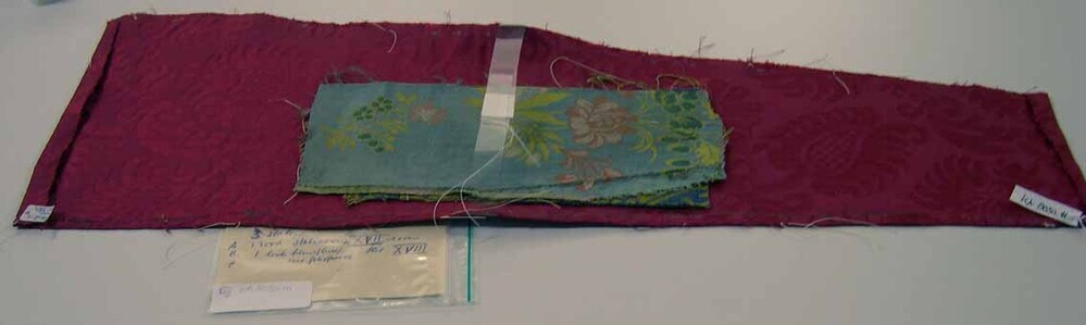 Drie stalen. Rode staal uit Italië, 17e eeuw. Blauw- gele staal, renaissance. Geel, rose en groene staal met bloemmotief, 18e eeuw.- Trefwoorden