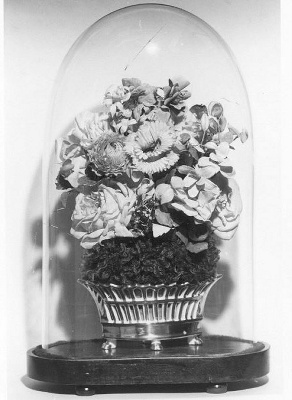 boeket in ajourschaal onder stolp op donker plateau- Trefwoorden