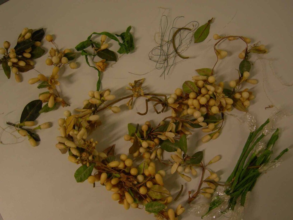 Oranjebloesem van was en stof. In veel onderdelen van verschillende grootte.- HerkomstDeze oranjebloesem is als garnering gebruikt op de bruidsjapon en sluier van de moeder van de schenkster bij haar huwelijk in 1880.