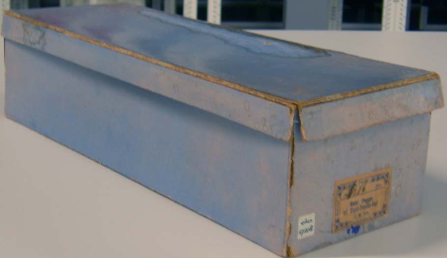 Doos voor oranjebloesems, 1880 papier hoogte: 10 cm; breedte: 40 cm; diepte: 14 cm; etiket vooraan op de korte zijde: Berliner Puppen Fabrik Charlottenburg