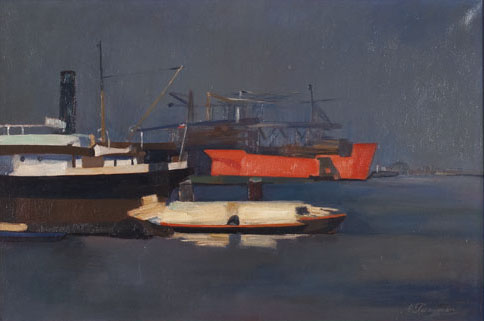 Tegelijk met het Noordzeekanaal wordt in 1876 de Houthaven aangelegd voor de aanvoer, overslag en opslag van hout. Bij de Spaarndammerbuurt ontstaat zo een complete houtindustrie, waarin veel arme dagloners werkzaam zijn. Kunstschilder Nicolaas Pieneman jr. legt het scheepsverkeer in de Houthaven begin twintigste eeuw vast. Op de voorgrond is het achtersteven van een vrachtschip te zien, erachter de felrode romp van een ander schip. Kranen op de kade steken erbovenuit. De oude haven wordt momenteel verbouwd tot een nieuwe, klimaatneutrale woonwijk. ( Sarah Remmerts de Vries)