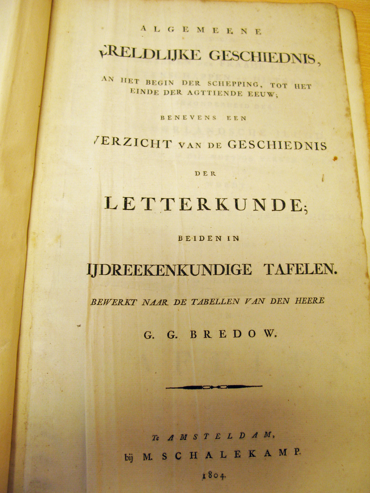 - Algemeene Wereldlijke Geschiedenis, van aan het begin der schepping, tot het einde der agttiende eeuw, benevens een overzicht van de geschiedenis der letterkunde; beiden in tijdreekenkundige tafelen. Bewerkt naar de tabellen van den heere G.G. Bredow, 1804