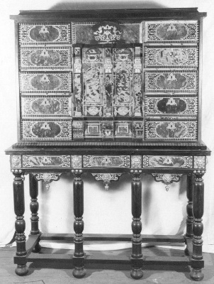 Kunstkabinet, 1700 - 1749 Vlaanderen hout (ebben), gezwart hout, partridge wood, notenhout, ivoor of been, ijzer, geelkoper, schildpad, gekleurde vulpasta's, parelmoer, naaldhout (vuren), eikenhout hoogte: 164.5 cm; breedte: 123.5 cm; diepte: 46 cm; potlood binnenzijde linker zijregel onderstel: P Holst
