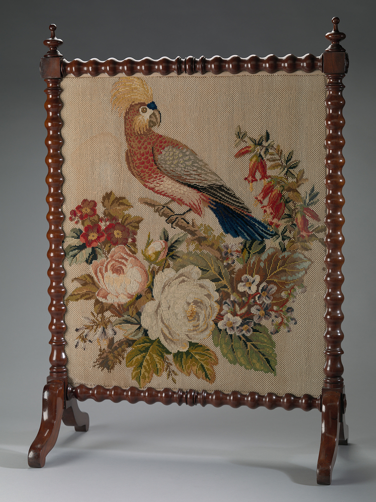 Het scherm is verdienstelijk geborduurd met een kuifkakatoe, gezeten op een tak met verschillende bloemen. Te herkennen zijn onder meer rozen. Fraai bewerkte schermen als deze zullen alleen ´s zomers, wanneer er geen haardvuur brandde, ter versiering in de lege schouw hebben gestaan. ( Bert Vreeken)