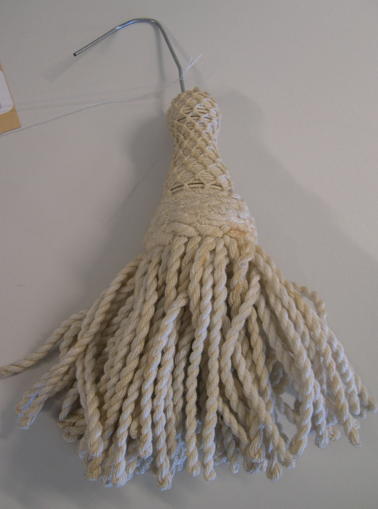 Witten katoenen kwast voor een gordijn, geknoopt op de houten knop, de franjes zijn gedraaid. Aan de knop zit een metalen haak.- Trefwoorden