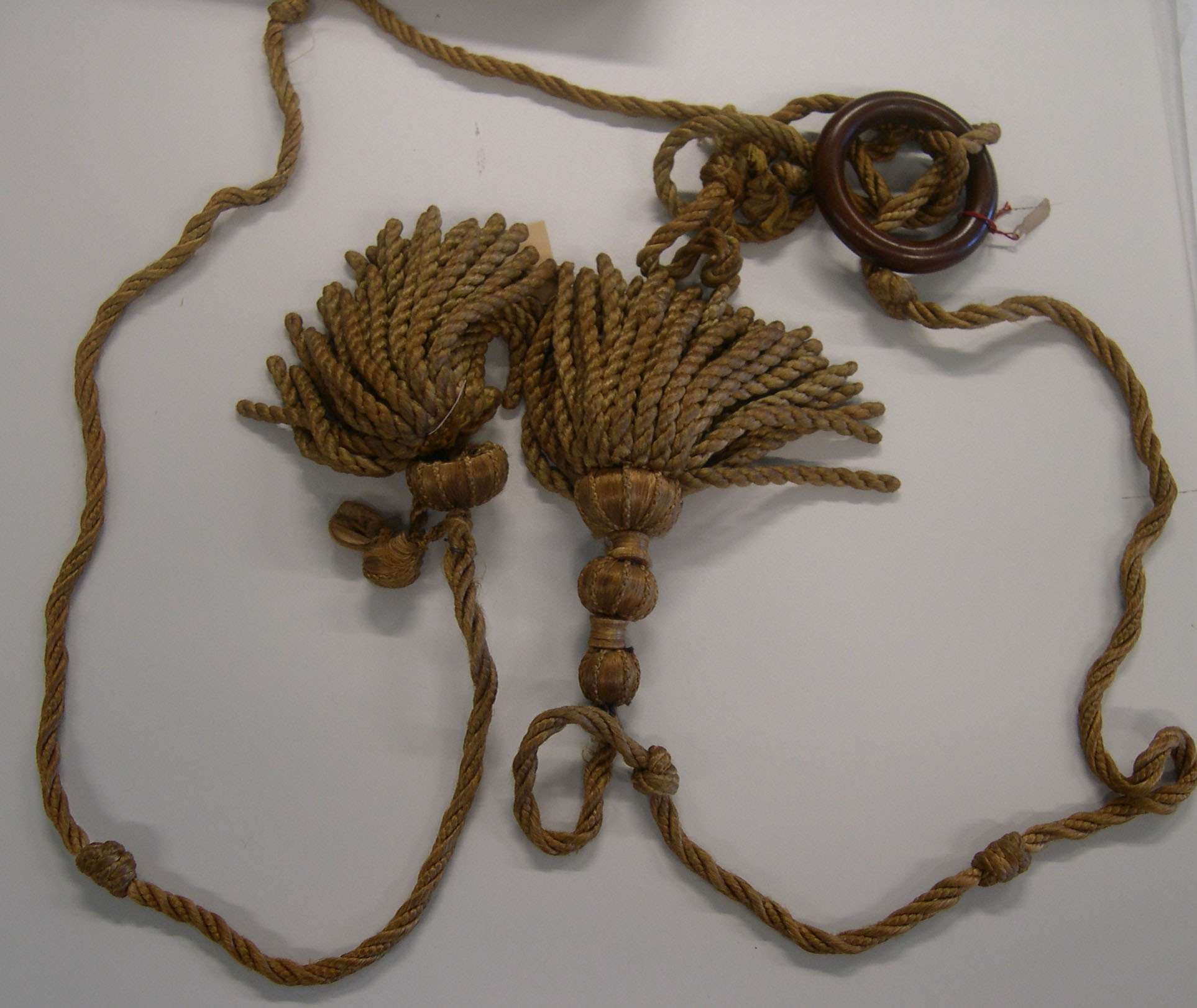 Twee goudkleurige kwasten met koord en een houten ring. De knop bestaat uit 3 delen. In het koord zitten enkele knopen.- Trefwoorden