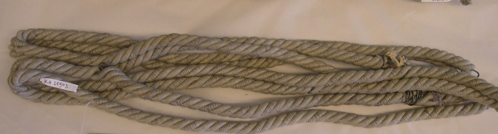Grijs gordijnkoord, met een metalen kern.- Trefwoorden