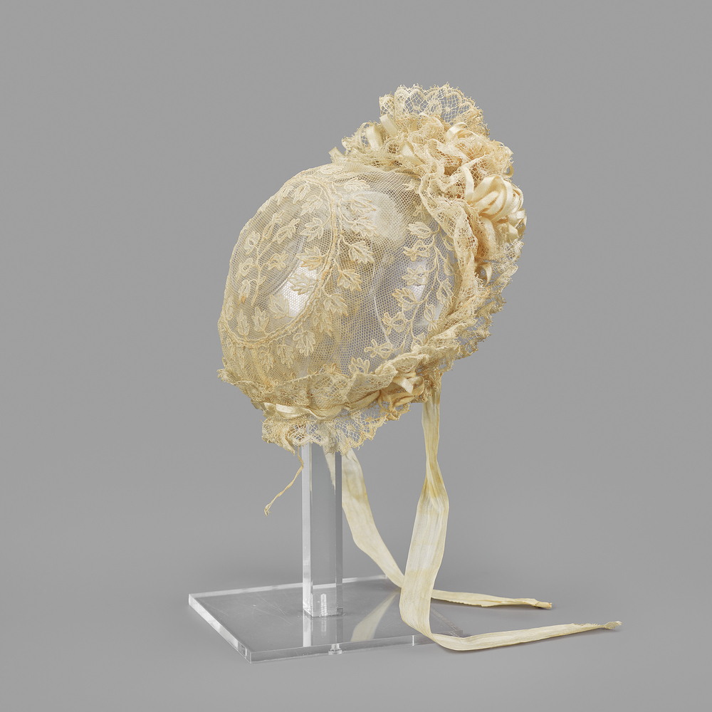 Kanten babymuts van geappliceerde tule, opgemaakt met geplooid kant en zijde lint. Twee zijden strikbandjes. Bijzondere muts.