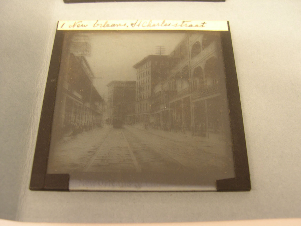 Toverlantaarnplaatje uit de serie 'Reis door Noord-Amerika'. No 1 New Orleans, Charlesstraat- Trefwoorden