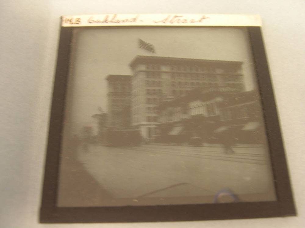 Toverlantaarnplaatje uit de serie 'Reis door Noord-Amerika'. No 14 Oakland straat- Trefwoorden