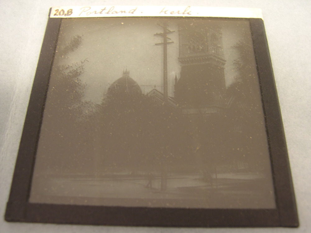 Toverlantaarnplaatje uit de serie 'Reis door Noord-Amerika'. No 20 Portland Kerk- Trefwoorden