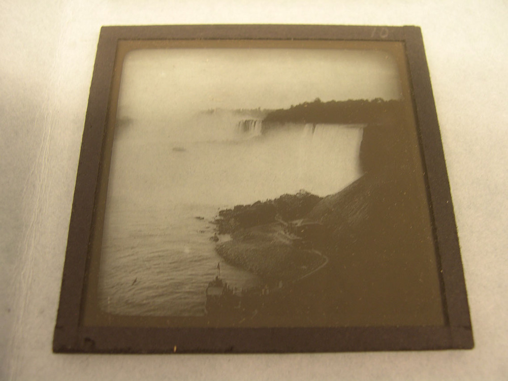 Toverlantaarnplaatje uit de serie 'Reis door Noord-Amerika'. No 10 Niagara watervallen- Trefwoorden