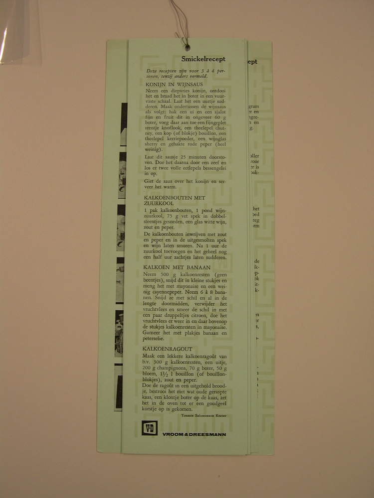 'Smickelrecept' met recepten van Toussie Salomonson-Keerzer. Zeven losse bladen, groen met zwarte tekst- Trefwoorden