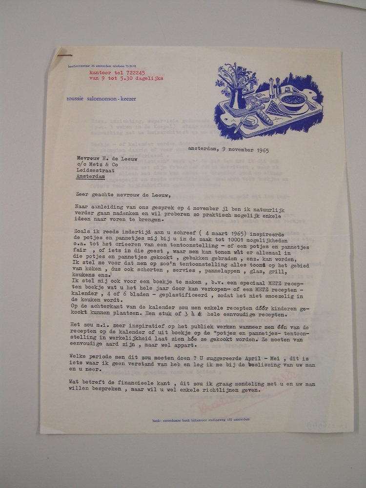 Brief van Toussie Salomonson-Keezer aan Mevr. H. de Leeuw (Metz & co). Twee pagina's.- Trefwoorden