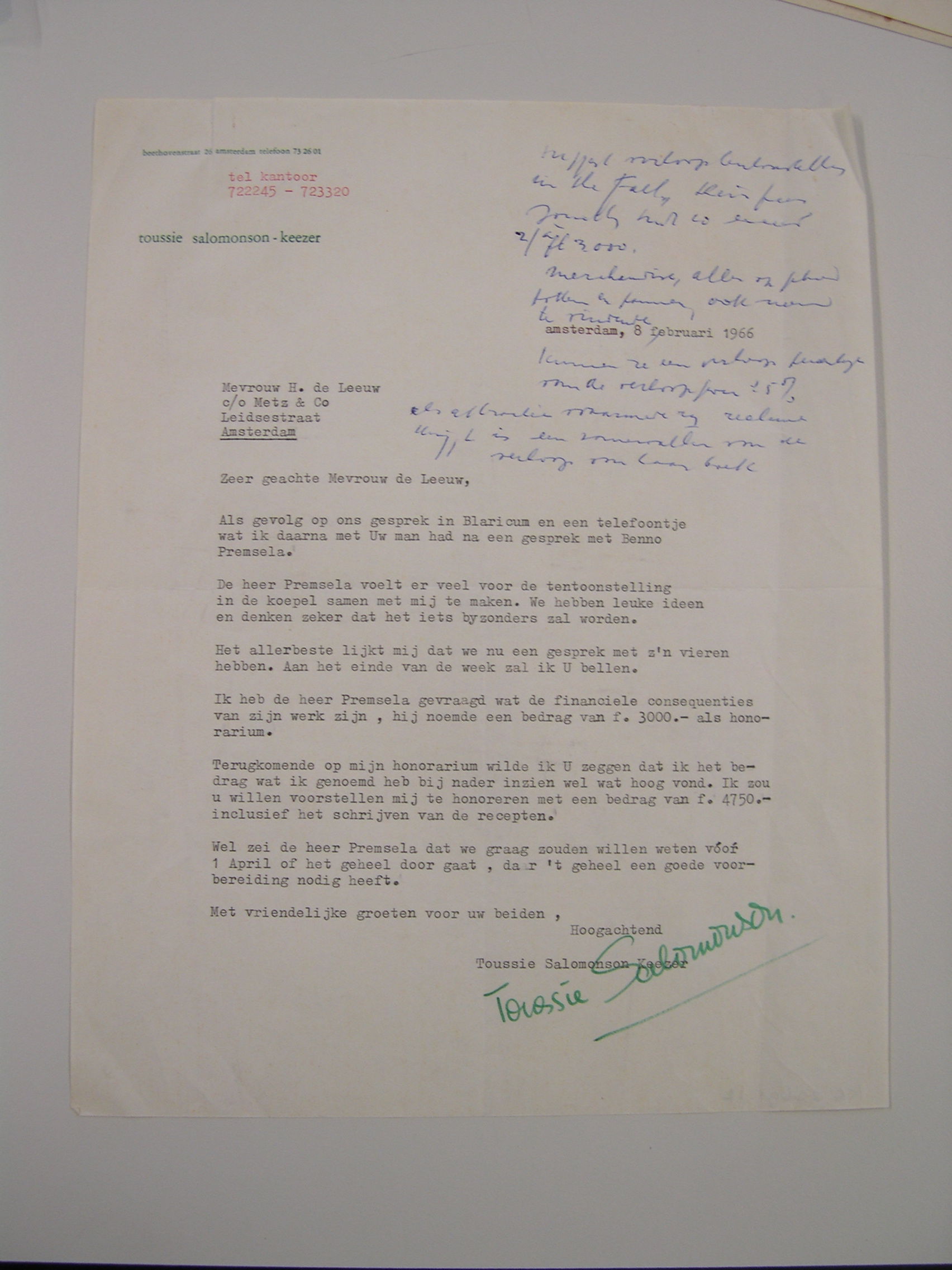 Brief van Toussie Salomonson-Keezer aan Mevr. H. de Leeuw (Metz & co).- Trefwoorden
