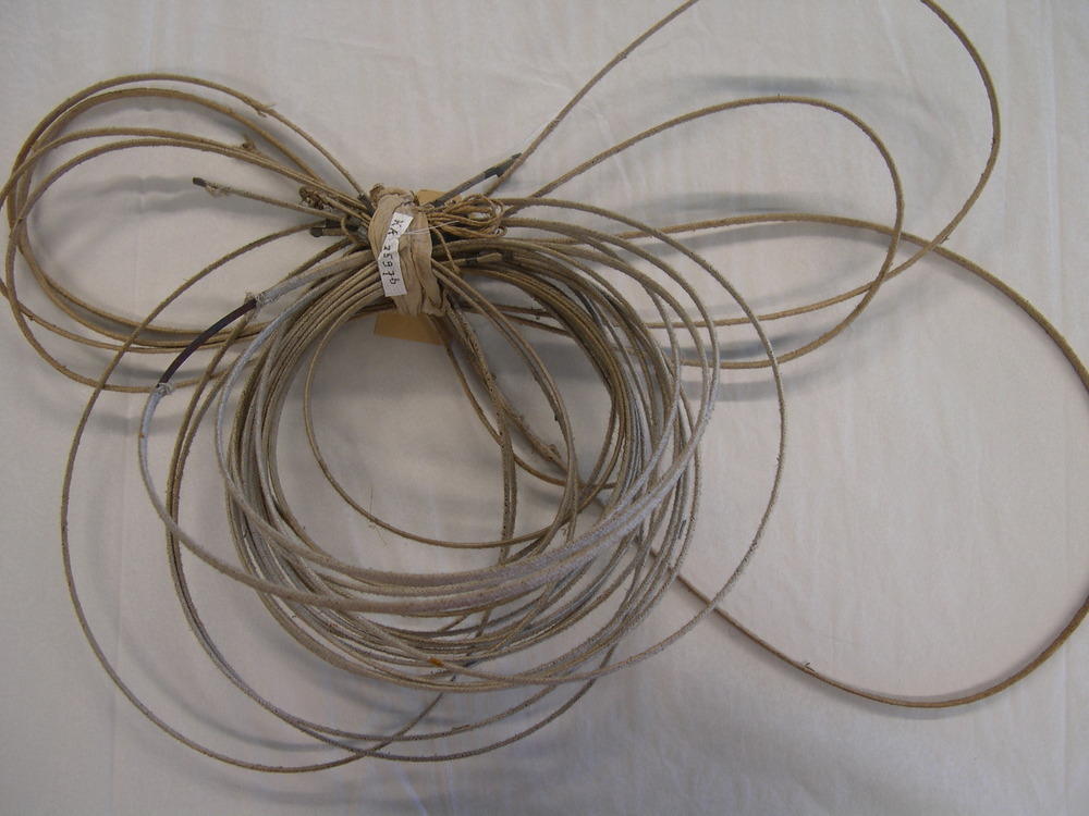 Negen hoepels afkomstig van een crinoline. Bestaande uit smal stalen band met katoen omsponnen. Twee hoepels zijn aan elkaar genaaid, de andere zeven zijn voorzien van metalen klemmen om mee te sluiten.