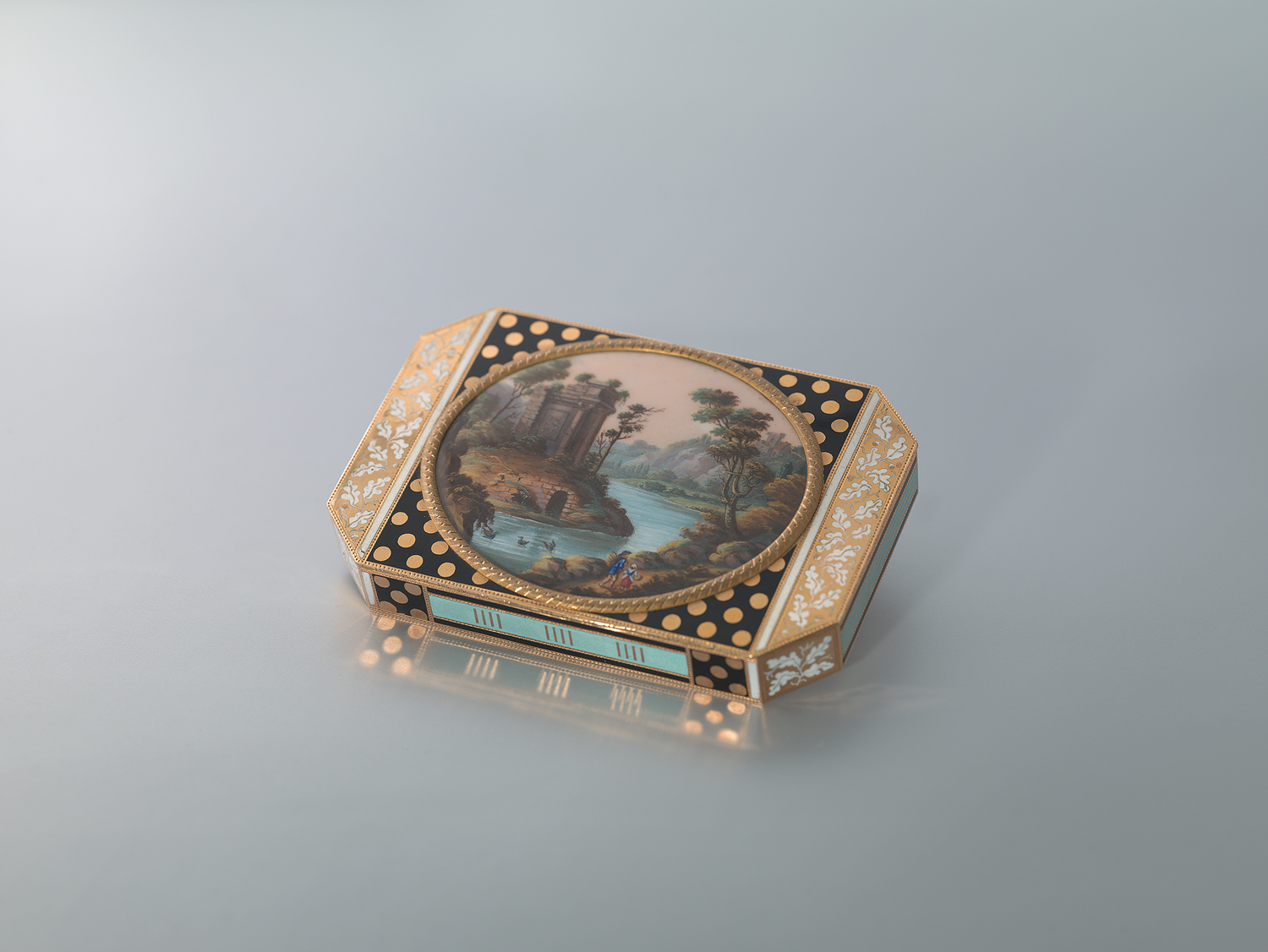 - Achtkantige snuifdoos met emaildecor van een rivierlandschap, 1800 - 1820