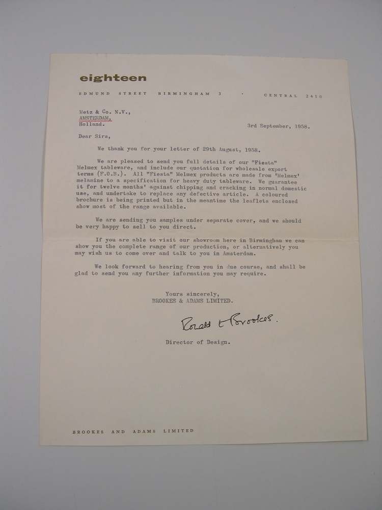 Brief van Eighteen aan Metz & co. Cremekleurig papier, getypt.- Trefwoorden