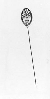 Een lange gouden speld met als knop een filigrain bloemenmandje in een ovaal gezet.- Trefwoorden