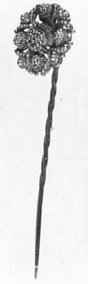 Ronde speld, filigrain bewerkte knop en sluitspeld.- Trefwoorden