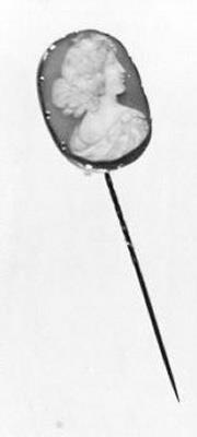 Speld met camée, wit profiel en buste naar rechts, met wingerdrank in het haar, op rose-bruine steen en goud genopt randje.- HerkomstLegaat van mevrouw S.A. Lopez Suasso-de Bruijn, Amsterdam, 1890.