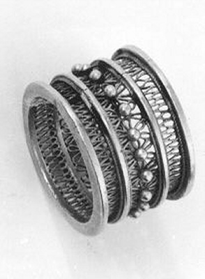 Ring met brede opengewerkte band, van vier randjes met zigzag- en in het midden nopjesversiering.- Trefwoorden
