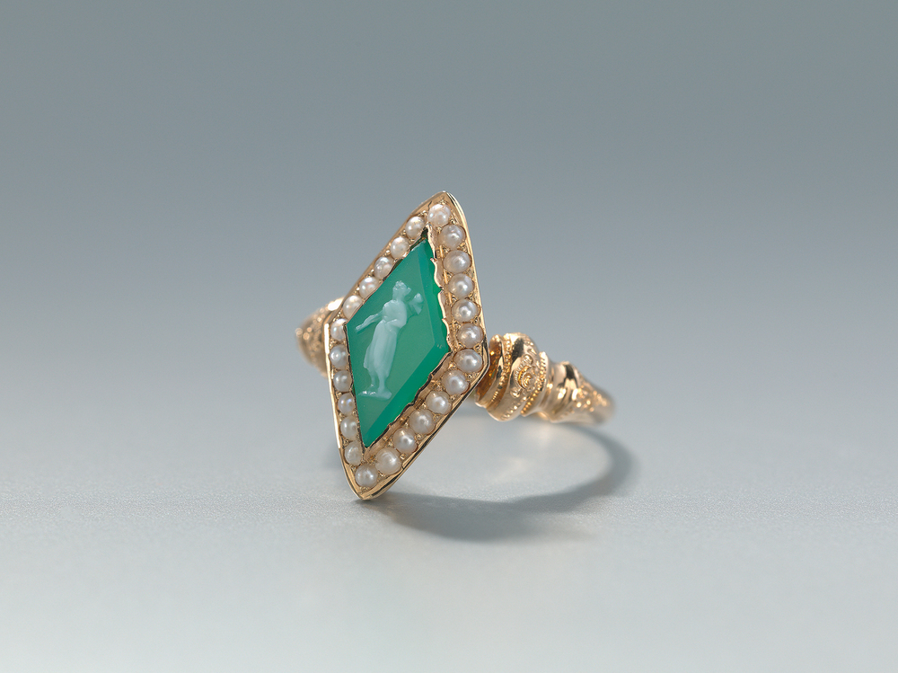 - Ring met ruitvormig groen glas versierd met een gesneden vrouwenfiguur, 1840 - 1860