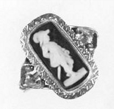 Ring met rechthoekige steen, wit reliëf van mansfiguur in achttiende eeuwse dracht op een zwart porseleinen fond. Rand heeft gegraveerde zigzag versiering. De scheen van de ring is hartvormig opengewerkt.- Trefwoorden