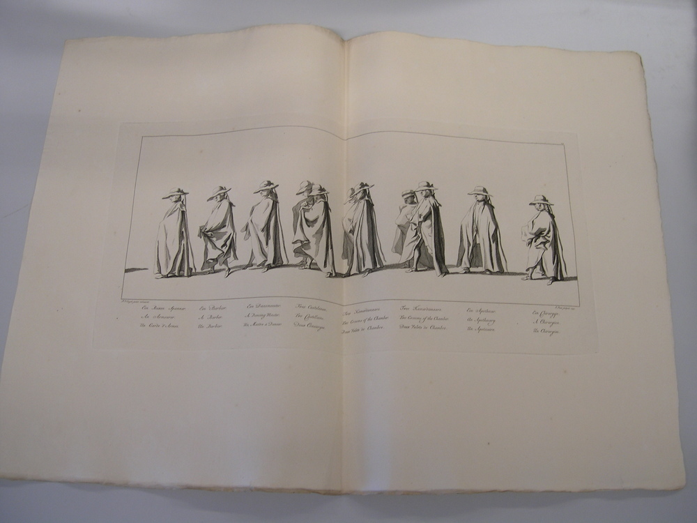 - opschrift onder gravure: Een buxenspanner, een Barbier, Dansmeester, Twee Casteleinen, Twee kamerdienaars, Apothecar, Chirurgijn