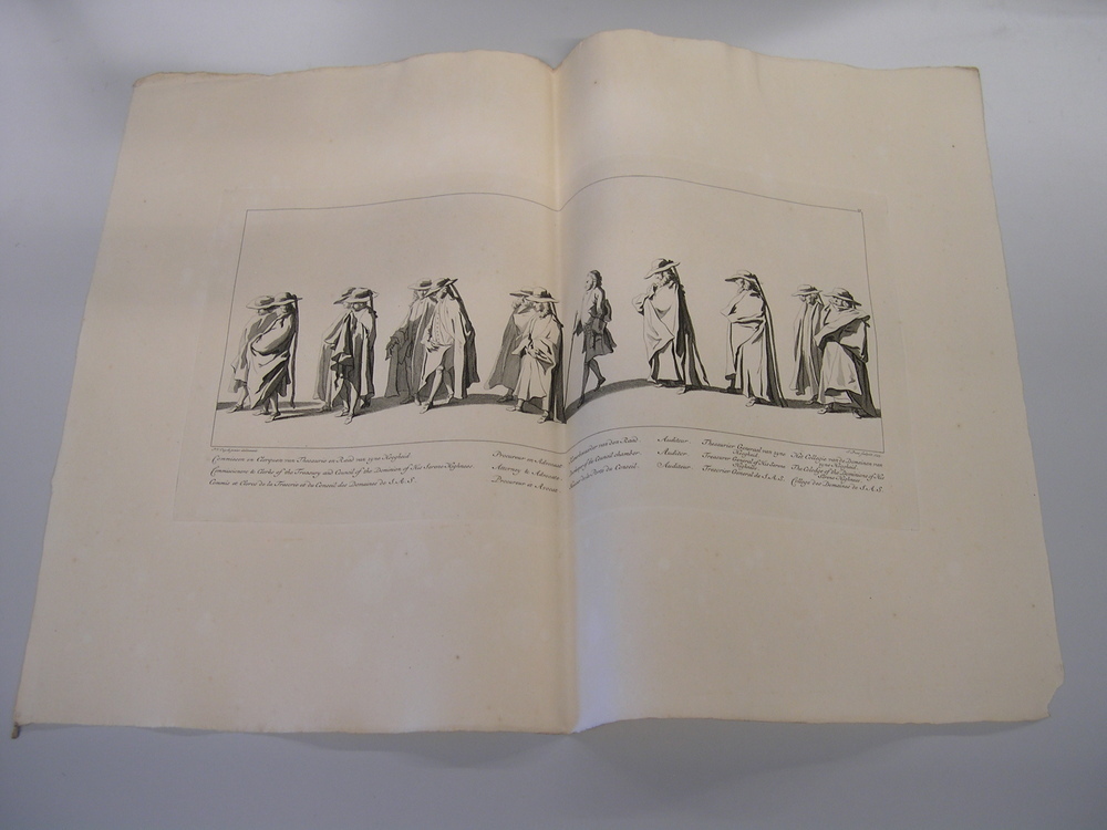 opschrift onder gravure: Commiesen en Clequen van Thesaurie en Raad van zijn Hoogheid, Procureur en Advocaat, Kamerbewaarder van den Raad, Auditeur, Thesaurier Generaal van zijne Hoogheid, Het Collegie van de Domeinen van zijne Hoogheid