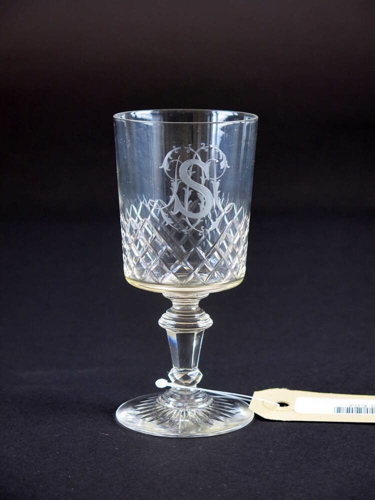 Dit drinkglas komt uit het bezit van de Amsterdamse architect Abraham Salm (1857-1915). Samen met zijn vader Gerlof Bartholomeus Salm (1831-1897) heeft Abraham een grote bijdrage geleverd aan de stedenbouwkundige veranderingen in Amsterdam in de tweede helft van de negentiende eeuw. Waar G.B. Salms naam onlosmakelijk verbonden is met de bouw van Artis in de Plantage, staat zoon Abraham vooral bekend om zijn herenhuizen, stadsvilla’s, (sigaren)fabrieken en paardentramremises, aanvankelijk in classicistische, later in meer historiserende eclectische stijl. Daarnaast ontwierp hij ook interieuronderdelen. Deze 24-delige kristallen drinkset is afkomstig uit het door A. Salm ontworpen huis aan de Weesperzijde 26, waar hij zelf woonde en werkte. Alle onderdelen van de set dragen het monogram ‘S’. ( Sarah Remmerts de Vries)