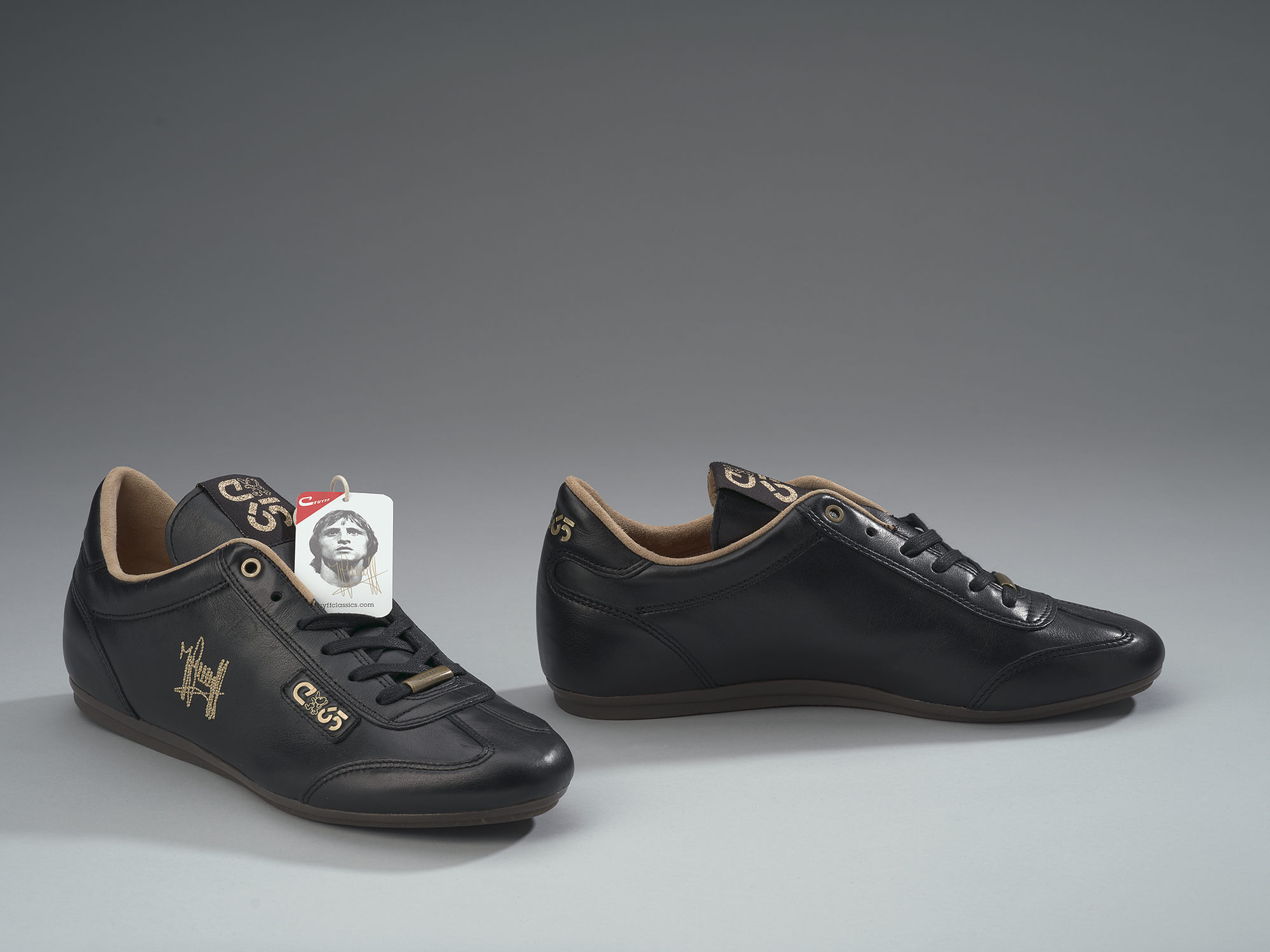 Schoen van Italiaans kalfsleer, voorzien van gouden gestikte handtekening van Johan Cruyff.- Trefwoorden