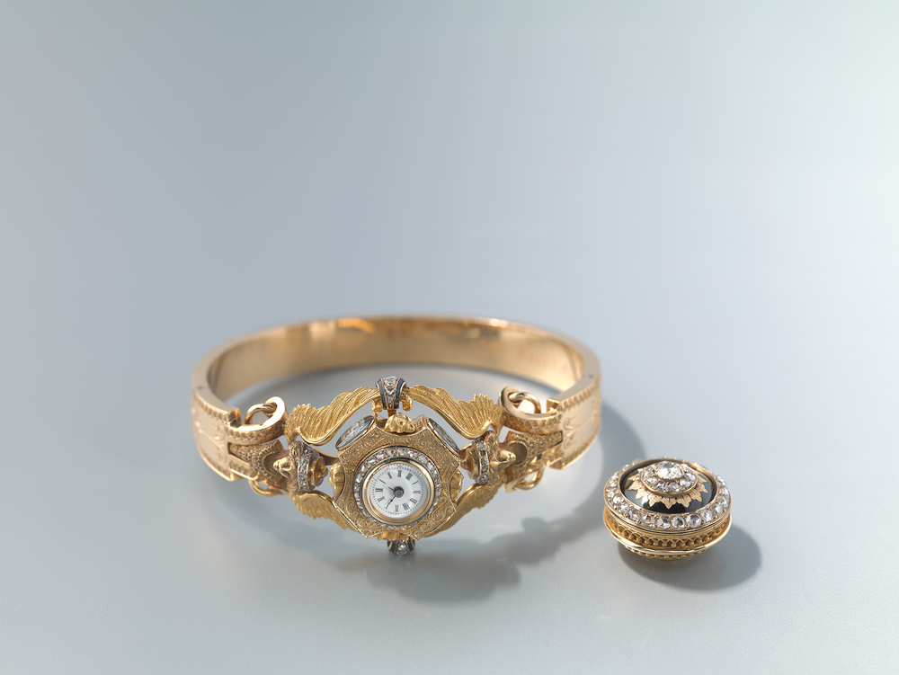 Deze kostbare armband, met inscriptie “Exposition 1867”, combineert horloge én sieraad ineen. Het is gekocht op de Parijse Wereldtentoonstelling van 1867 waar landen het nieuwste op gebied van kunstnijverheid en techniek presenteerden. Het mee naar huis nemen van (kostbare) souvenirs werd door de Wereldtentoonstellingen in de late 19de eeuw populair. ( Annemarie den Dekker)