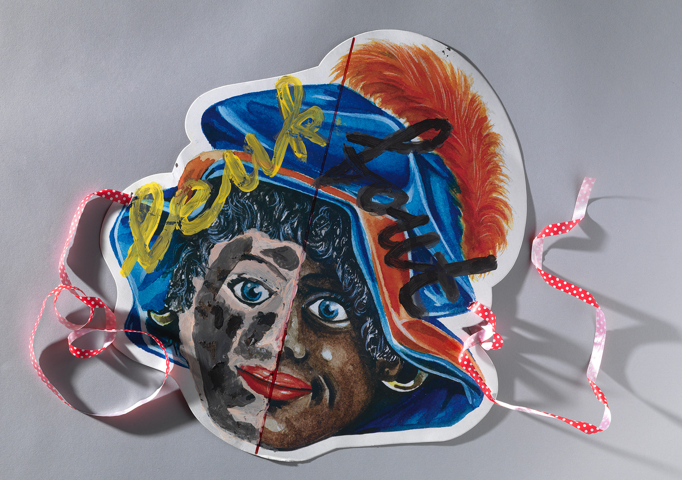 In 2012 kreeg kunstenaar Iris Kensmil (1970) dit masker en gedicht als Sinterklaassurprise van haar partner Ferdinand van Dieten. Hij bewerkte een commercieel Zwarte Pieten masker, dat opmerkelijk genoeg blauwe ogen heeft. De rechterhelft voorzag hij van het woord ‘fout’. Hij beschilderde de linkerhelft tot een zogenaamde roetvegen piet en schreef daarboven ‘leuk’.