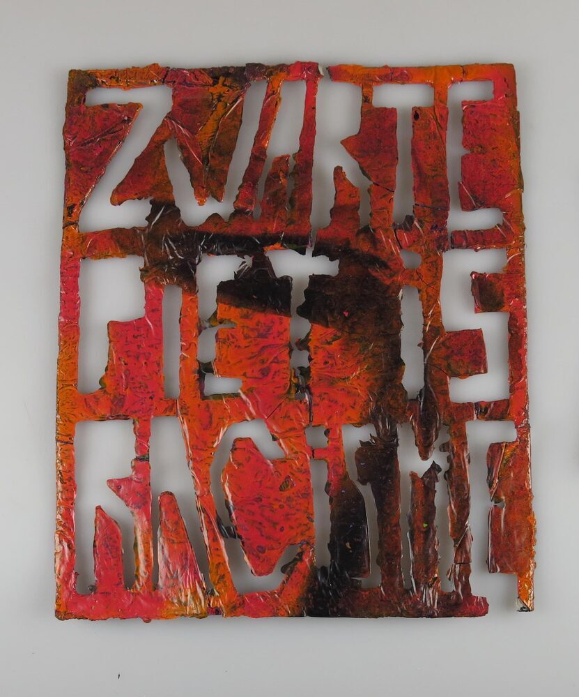 Met spuitbusverf bespoten pizzadoos. Gebroken in vier à vijf delen.- Trefwoorden