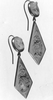 Ovaal gesneden steentje met vrouwenkop en langwerpig ruitvormige steen, vrouwenkop met bloemmotief. Gezet in gladde, geelkoperen ring.- Trefwoorden