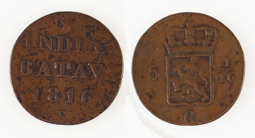Deze koperen munt uit 1816 heeft de waarde van één duit (eenzestiende van een stuiver). De munt is afkomstig uit Nederlands-Indië en is uitgegeven onder de regering van koning Willem I (1815-1840). Op de voorzijde is het gekroonde rijkswapen met de Nederlandse leeuw afgebeeld, evenals de waarde van de munt. De keerzijde toont de tekst INDIAE BATAV: 1816. 'Batav' is een afkorting voor Batavia, destijds de hoofdstad van Nederlands-Indië. ( Sarah Remmerts de Vries)
