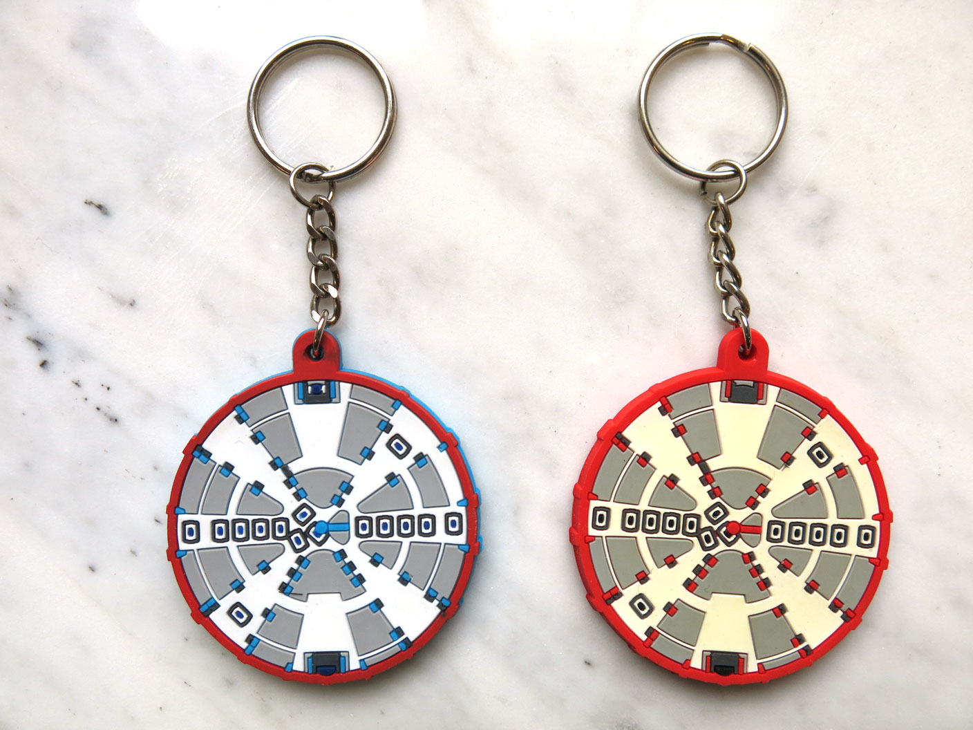Deze twee sleutelhangers zijn gemaakt als aandenkens aan de tunnelboren Noortje en Gravin, die beide gebruikt werden voor het graven van metrotunnels voor de Noord/Zuidlijn. In 2002 nam de Gemeente Amsterdam het definitieve besluit tot de aanleg van de Noord/Zuidlijn, een metrolijn die het mogelijk maakt binnen zestien minuten van het Buikslotermeerplein naar Station Zuid te reizen. De lijn zal straks een geschat aantal van 121.000 passagiers per dag vervoeren. Beide sleutelhangers kennen min of meer dezelfde voorzijde, maar dan uitgevoerd in andere kleuren. Op de achterzijde is te lezen dat de rode sleutelhanger bij tunnelboor Noortje hoort en de blauwe bij tunnelboor Gravin. ( Sarah Remmerts de Vries)